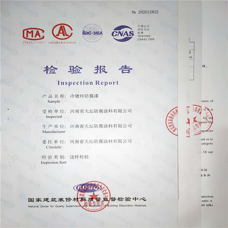 【注意事項】因鋅粉含量高,所以在調(diào)配時建議使用機械攪拌把甲組份攪拌均勻后,再加入乙組份攪拌均勻。漆膜表面易行成鋅鹽,故不宜長期暴露,在涂裝后道涂料之前,必須徹底清除表面的鋅鹽,否則影響漆膜的層間附著力。